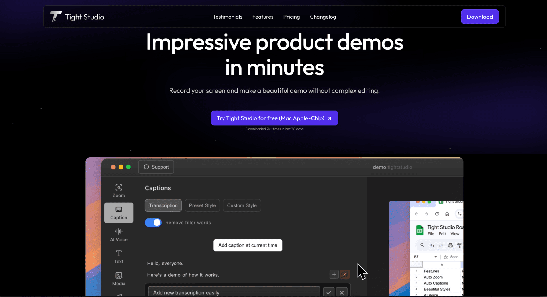 TightâŻStudio helps you turn raw screen recordings into professional, shareable product demosâfeaturing auto-zooms, AI voiceovers, captions, and slick animations.