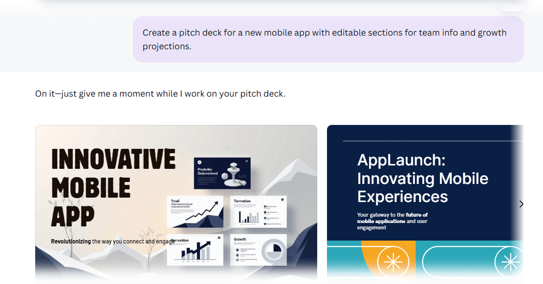 Example: “Create a pitch deck for a new mobile app with editable sections for team info and growth projections.”
